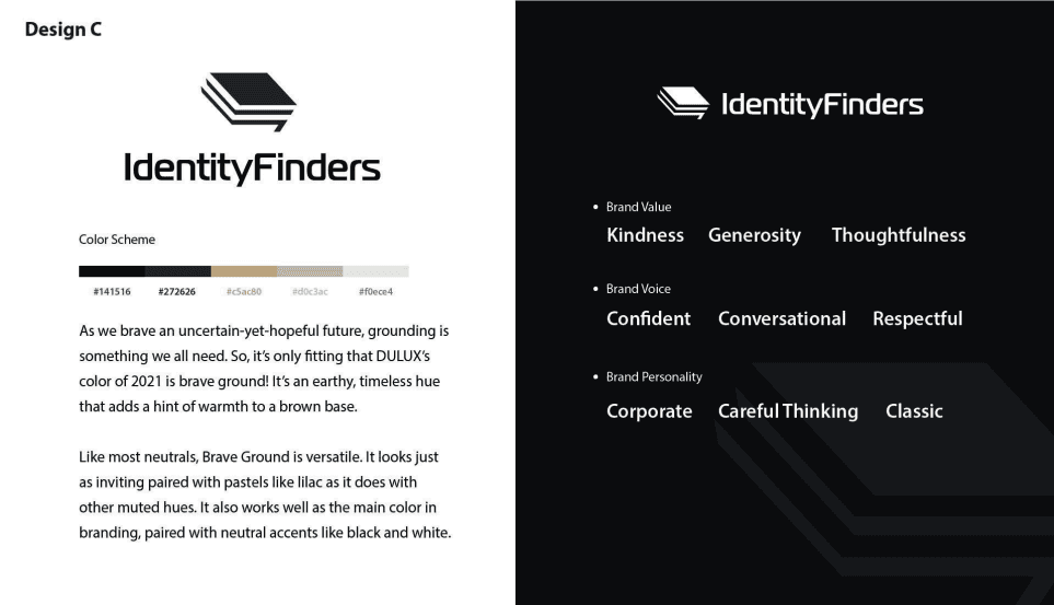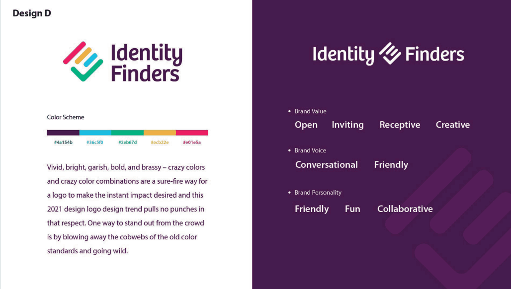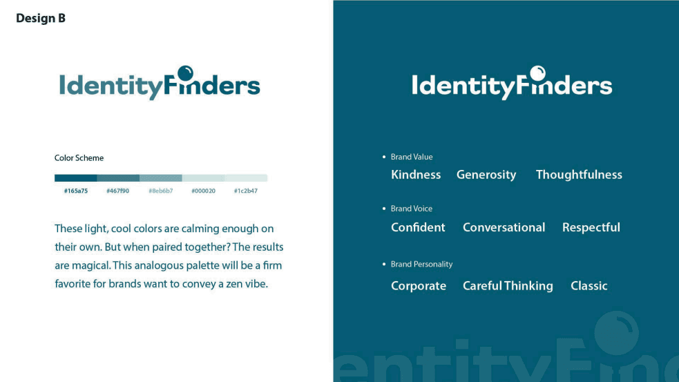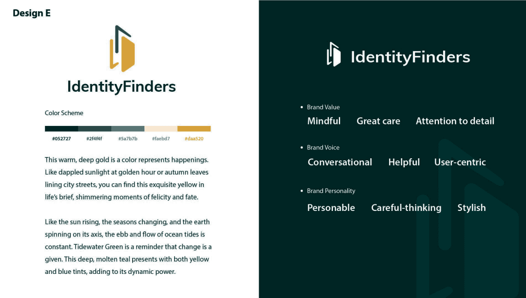Branding can easily become subjective, so I structured the work to stay focused and defensible. I started by scanning current design trends to set a relevant visual direction, then clarified the product’s purpose by defining the “why” and “how” behind IdentityFinders to guide decisions. From there, I mapped visual themes and potential elements, explored multiple directions, and progressively narrowed options through critique and alignment, ensuring each final choice was intentional rather than purely aesthetic.