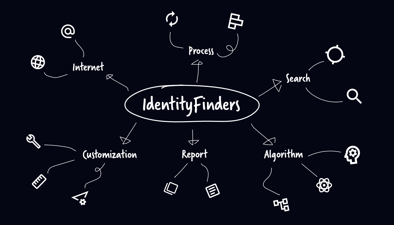 Early visual ideation mind map for IdentityFinders—mapping the brand to its core ideas (search, algorithm, reporting, process, customization, and internet signals) to generate consistent iconography and visual metaphors before narrowing into a final direction.